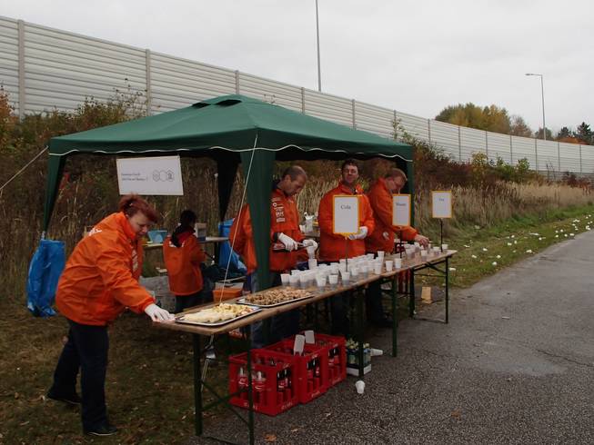 Kieselgrund 10.58 Uhr / Km 9,8 Nun ging es hinter dem Schallschutz weiter. Hier einer von den vielen Verpflegungsständen, die man recht regelmäßig alle 2,5 Kilometer antraf. |