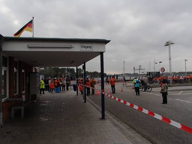 Vorderreihe / Kleinboothafen 11.52 Uhr / Km 19,2 An der Priwall-Fähre vorbei ging es in Wasser-Nähe durch den Ort. |