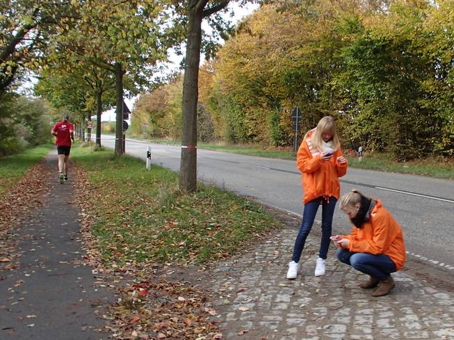 Travemünder Landstraße 12.46 Uhr / Km 28,9 Was haben Streckenposten eigentlich vor Erfindung von Handys und Smartphones gemacht? Egal. Ich hatte noch nie so viele Streckenposten an völlig unsinnigen Ecken bei einem Marathon gesehen. Der Anblick der orangen Jacken war ja immer ganz nett, aber auf was sollen zum Beispiel diese Zwei hier aufpassen? |