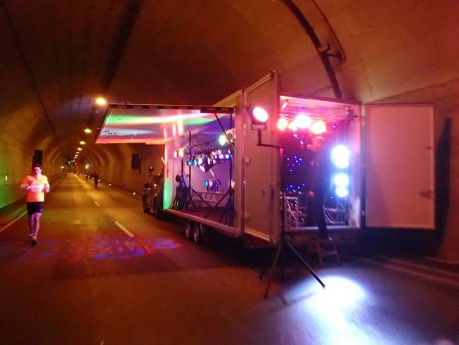 Travemünder Allee / Herrentunnel 10.53 Uhr / Km 9,0 In der Tunnelmitte gab es eine hübsche Lightshow und laute Musik. Die war von einem Tunnelende bis zum anderen zu hören. |