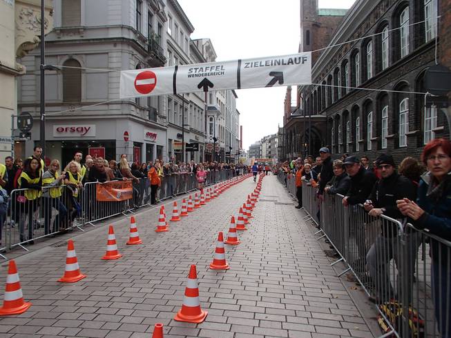 Breite Straße 13.58 Uhr / Km 42,1 Das Ziel vor Augen. Oder eben nicht. Das Ziel war ja auf dem Markt. Und dazu mußte man noch durch die Rathausarkaden durch. Den kniffeligen Schlenker hatten wir ja morgens schon mit Argwohn beäugt. |