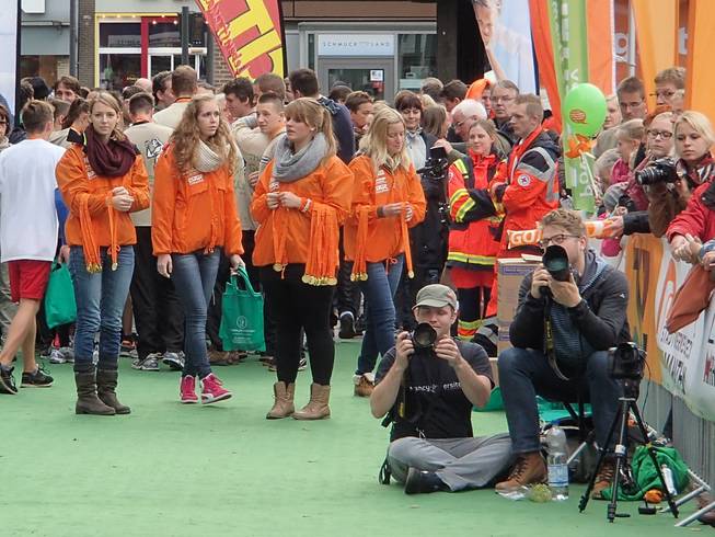 Markt 13.59 Uhr / Km 42,205 4. Plötzlich vor der Wand der oranger Medaillen- Verteilerinnen stehen. Offenbar war ich also im Ziel. Hmmm... das Zieltor hatte ich weiter hinten in Erinnerung gehabt und daher verpaßt. |