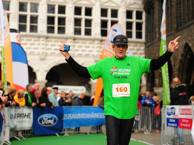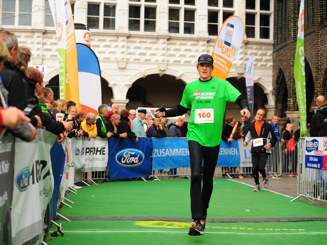 Markt 13.59 Uhr / Km 42,205 3. Und dann merkte auch ich was los was und kriegte die Arme allmählich hoch. Oh ja, auch in meinem 103. Marathon gab es etwas neues. Ich hatte das Ziel verpennt. |