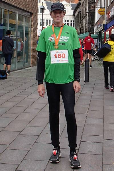 Markt 13.59 Uhr / Km 42,197 2. Der graue Balken auf dem Boden hinter mir markiert das Ziel. Ich war also schon durch, hatte es aber nicht mitbekommen. |
