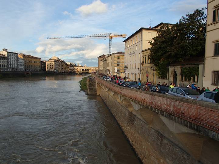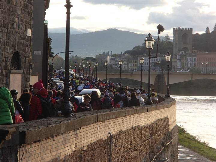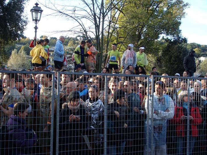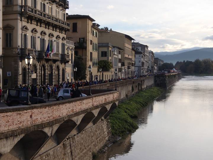 Lungarno del Tempio 8.50 Uhr Das erinnerte mich mehr an die Deutsche Botschaft in Prag im September 1989 als an einen organisierten Marathon. Der Zaun wurde dann bald zum größten Freiluft-Klo von Florenz. Wie schön, daß sich der Gestank bei den kühlen Temperaturen in Grenzen hielt. |