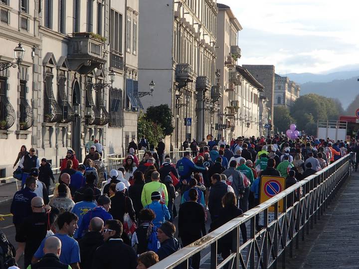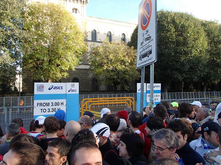Lungarno del Tempio 8.35 Uhr Man hätte das Problem natürlich entschärfen können, indem man die Tore zur Startaufstellung geöffnet hätte. Tat man aber nicht. Laut der noch mit den Start-unterlagen verteilten Info sollten die Startblöcke um 8.00 Uhr geöffnet und um 8.40 Uhr geschlossen werden. Ganz ausdrücklich wurde darauf hingewiesen, daß Läufer, die nach 8.40 Uhr kämen, von ganz hinten würden starten müssen. Also kein Wunder, daß um 8.35 Uhr so viele Läufer vor dem Tor standen. |