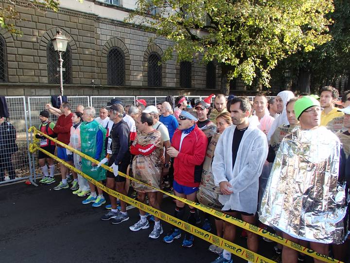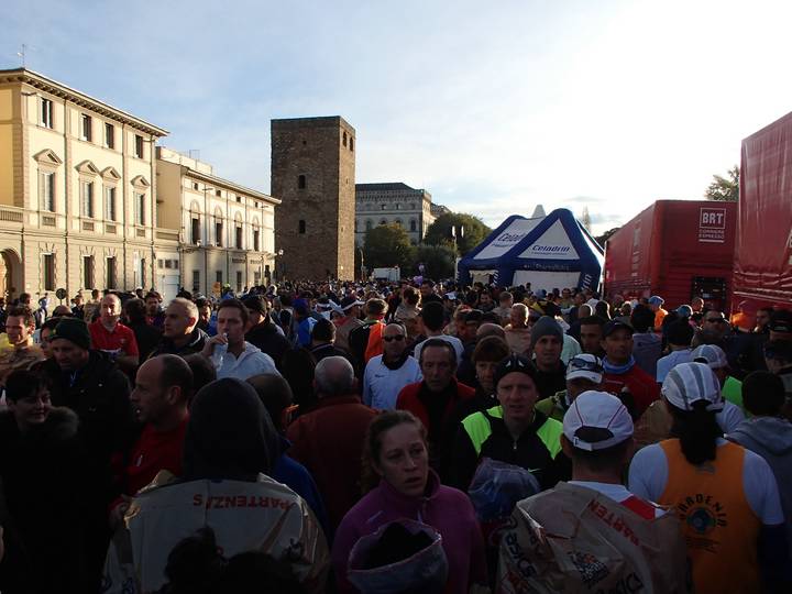 Lungarno del Tempio 8.29 Uhr Leider kam man nicht zu den Toiletten. Die waren 200 Meter voraus. Die LKWs für das Gepäck 200 Meter zurück. Rechts ging es hinter Mauer acht Meter steil bergab und links war die Startaufstellung. Als Weg für hin und zurück hatten nun rund 10.000 Läufer plus Anhang nur diese schmale Gasse. Da ging gar nichts mehr. Das war schon mehr als nur dilettantisch. So etwas bescheuertes hatte ich noch nie erlebt. Aber das ging ja noch besser. |