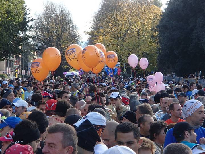 della Zecca 8.52 Uhr Allen Widrigkeiten zum Trotz versammelten sich die Läufer dann doch in der Startaufstellung. Und die bunten Ballons der Zeit-Läufer kamen auch. |