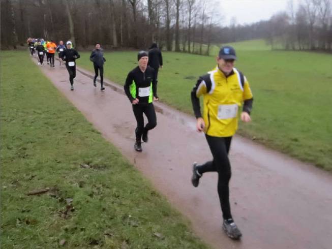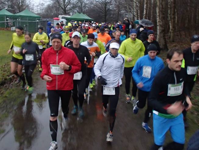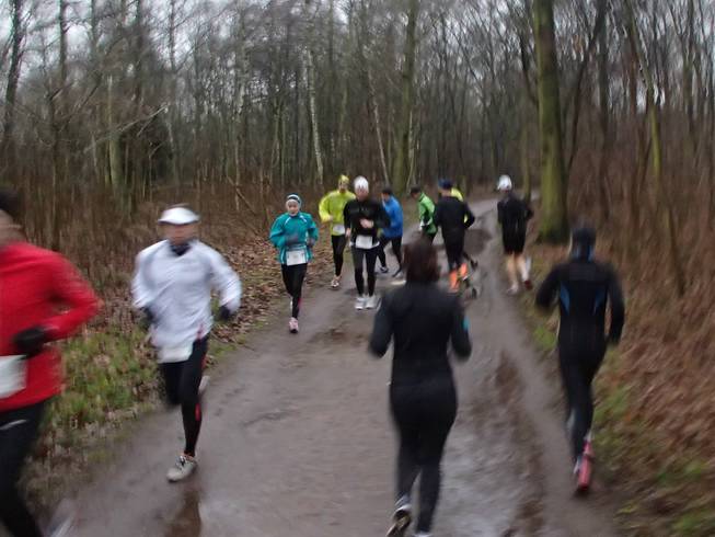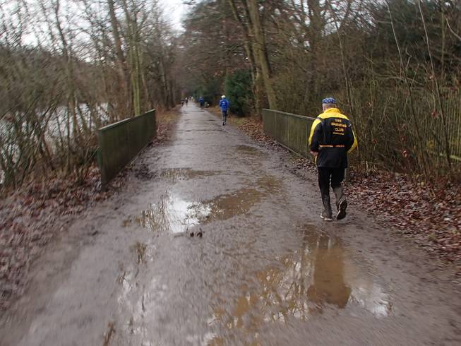 Runde 1 9.17 Uhr / Km 1,5 Und schon zu Beginn war klar, daß dies ein ziemlicher Matsch- und Modder-Lauf werden würde. Man war sehr damit beschäftigt, einen trocknen Weg um die Pfützen herum zu finden. |