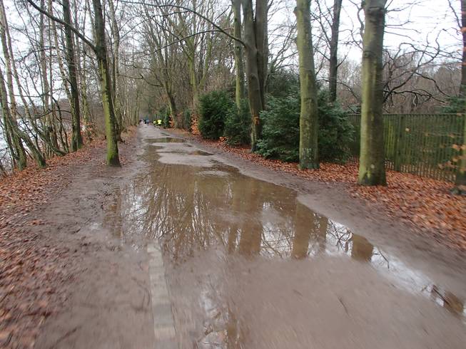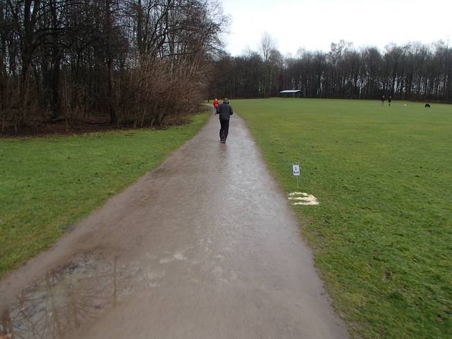 Runde 11 12.36 Uhr / Km 39,4 Und wieder die Pfützen-Landschaft. Die Ideal-Linie hatte sich im Laufe des Marathons mehrfach geändert. Naja... meine Schuhe waren immer noch relativ trocken. |