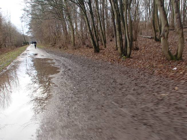 Runde 8 11.40 Uhr / Km 28,5 Es wurde nicht besser. Die Pfützen blieben dort wo sie waren und die Ränder waren immer mehr kaputt gelaufen und wurden von Runde zu Runde rutschiger und schlammiger. Schönes Laufes geht anders, aber immerhin war man so mit etwas beschäftigt. Nämlich der Suche nach dem besten Weg. |
