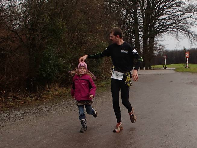 Runde 11 12.35 Uhr / Km 39,2 Während ich noch etwas am Tempo zulegte hatten andere mehr Zeit. So zum Beispiel um der Tochter im Laufen die Mütze richtig aufzusetzen. |