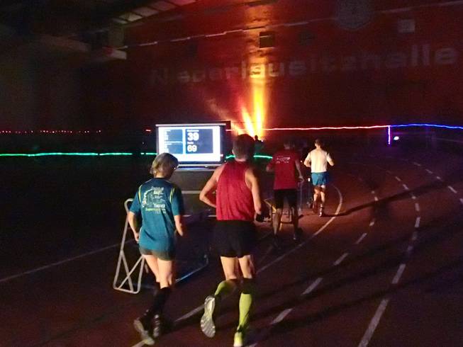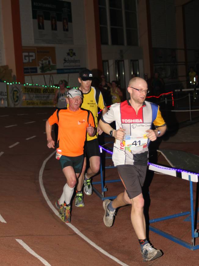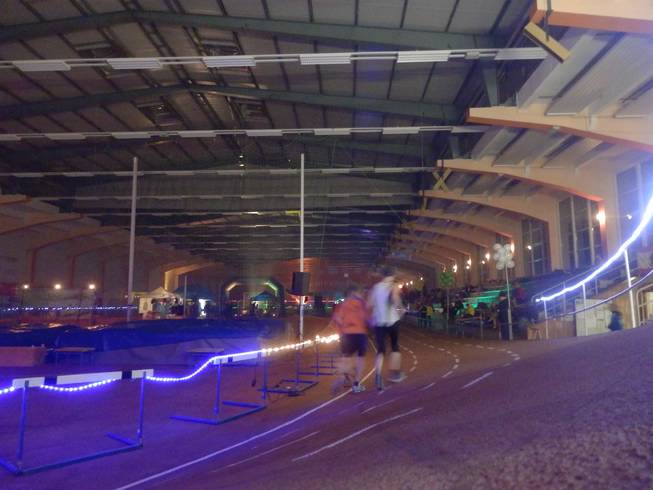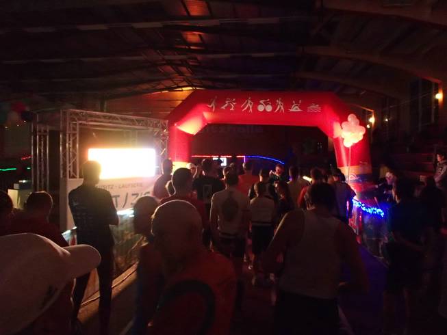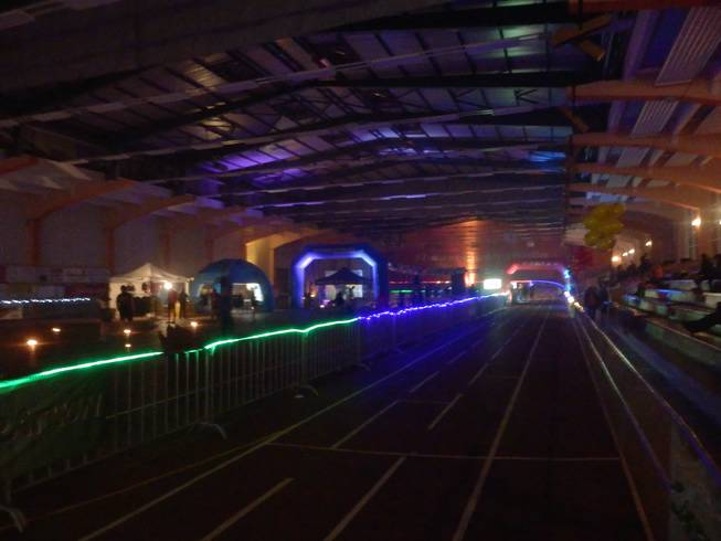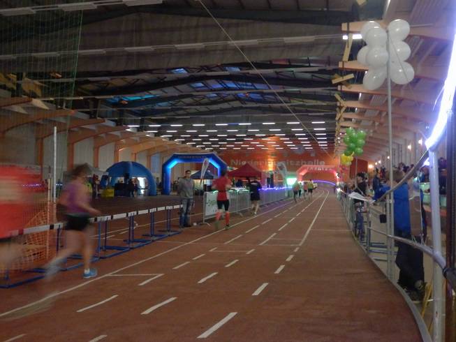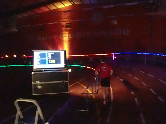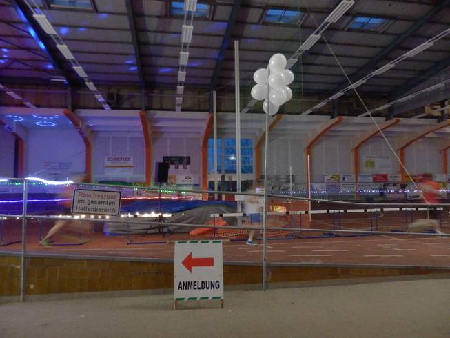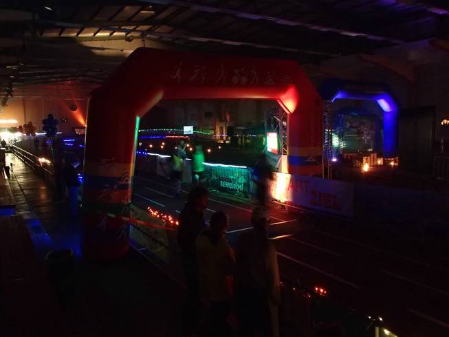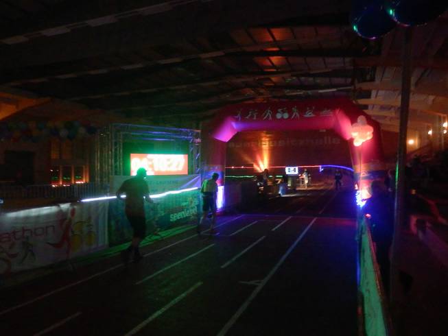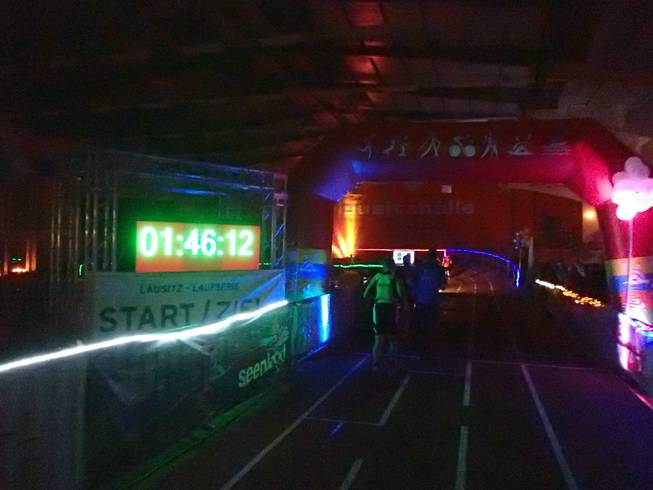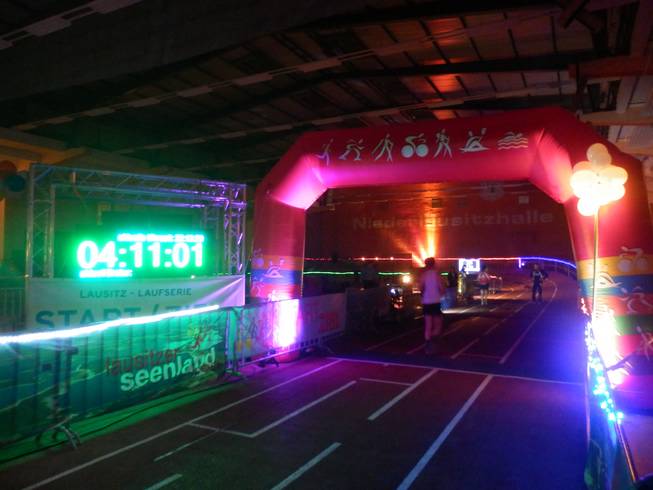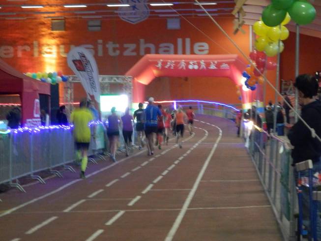 Niederlausitzhalle Senftenberg Um 18.02 Uhr dann der Start zum Marathon. Ich hätte mir vorher besser Gedanken um den Namen des Laufes machen sollen: Nacht-Marathonlauf. Man machte tatsächlich das Licht in der Halle aus. Es blieben die Lichterketten zur Kurs-Markierung. Noch 169 Runden. |