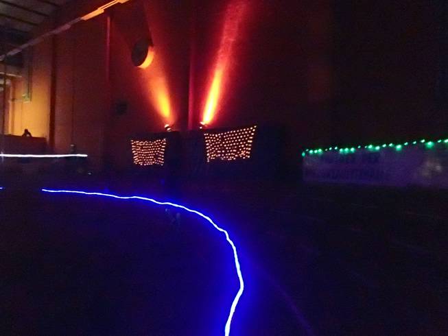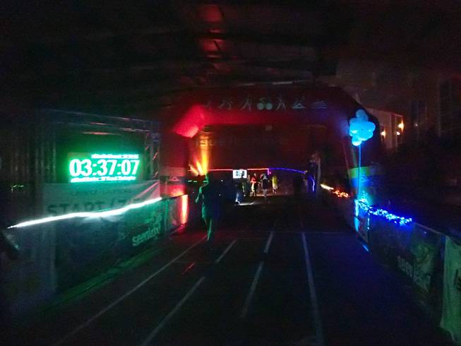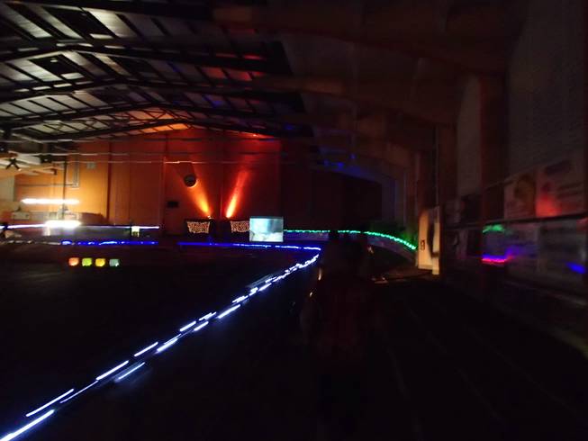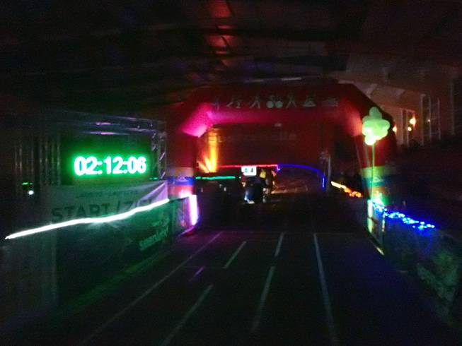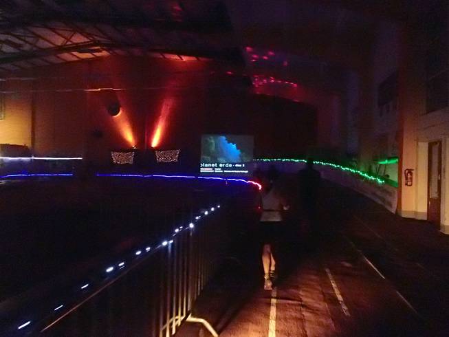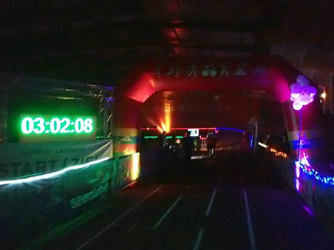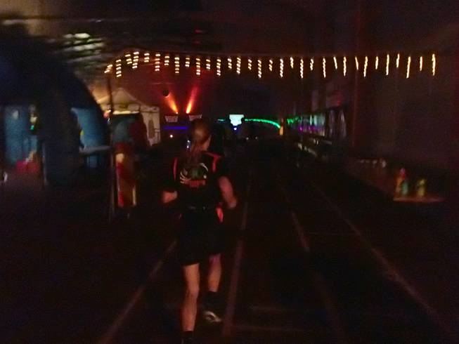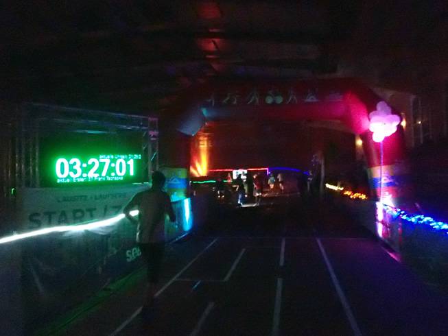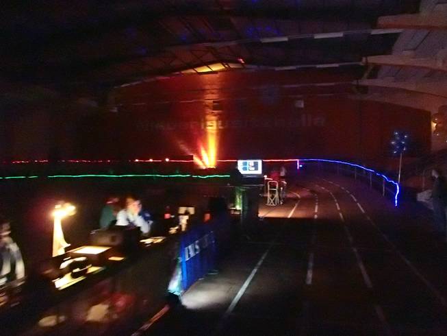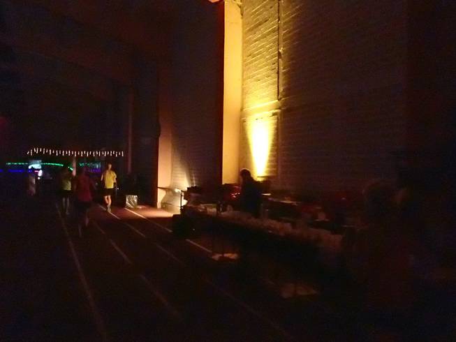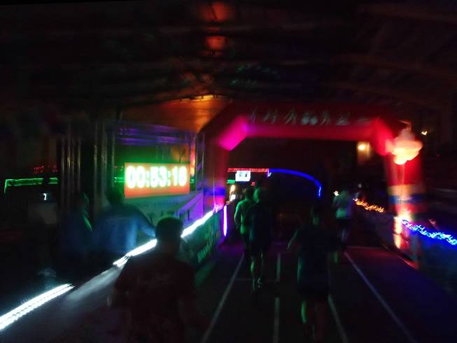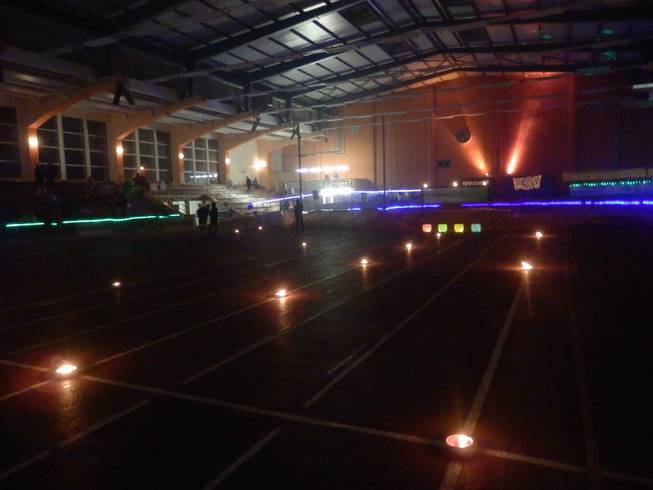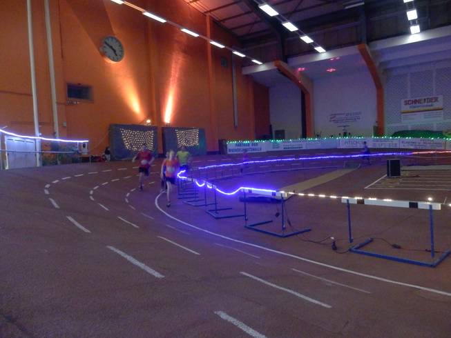 Niederlausitzhalle Senftenberg Um 18.02 Uhr dann der Start zum Marathon. Ich hätte mir vorher besser Gedanken um den Namen des Laufes machen sollen: Nacht-Marathonlauf. Man machte tatsächlich das Licht in der Halle aus. Es blieben die Lichterketten zur Kurs-Markierung. Noch 169 Runden. |