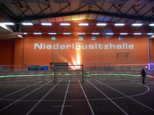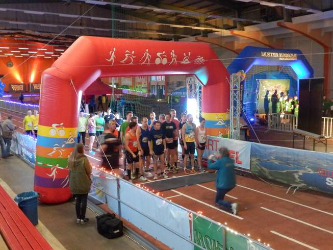 Niederlausitzhalle Senftenberg Während im Hintergrund noch die Siegerehrung der Niederlausitz-Laufserie 2013 lief, ging es auf der Bahn in die Startaufstellung. |