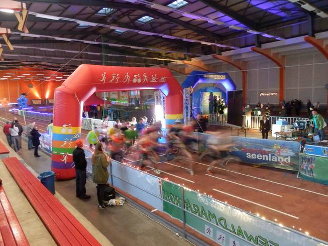 Niederlausitzhalle Senftenberg Die Veranstaltung geht von Samstag früh bis Sonntag in den Nachmittag. Es werden so ziemlich alle Strecken angeboten: 250 Meter, 1 Km, 3 Km, 5 Km, 10 Km (als Einzel- und Paarlauf), Halbmarathon, Marathon und 50 Km. |