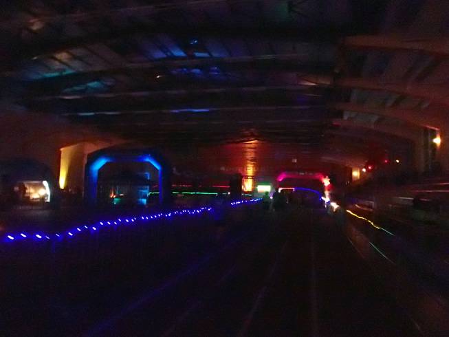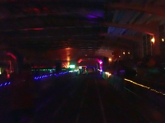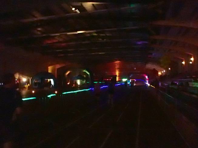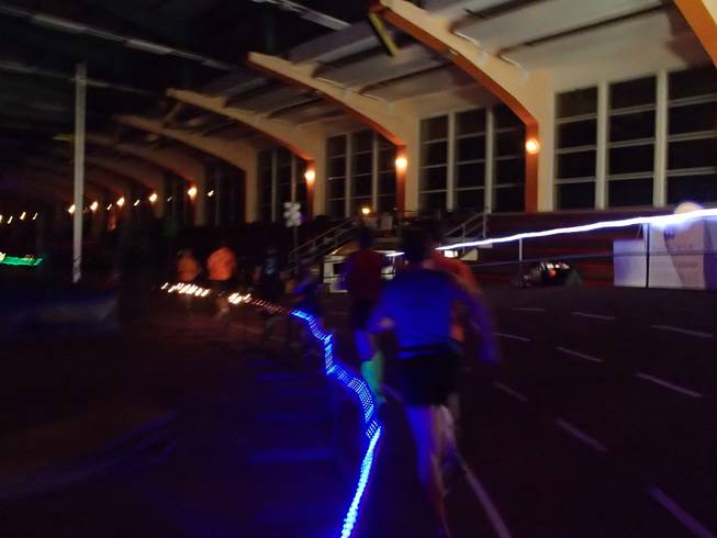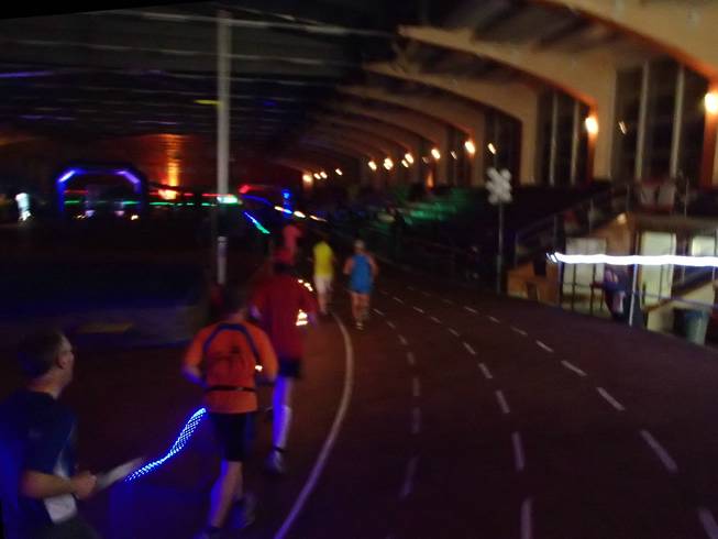 Runde 8 18.12 Uhr / Km 1,95 Lichttechnisch war das echt grausam. In den Kurven guckte man immer auf die Lichterkette runter und sah dann den Boden nicht mehr. Man mußte sich also schon blind darauf verlassen, daß die Bahn fehlerfrei war. |