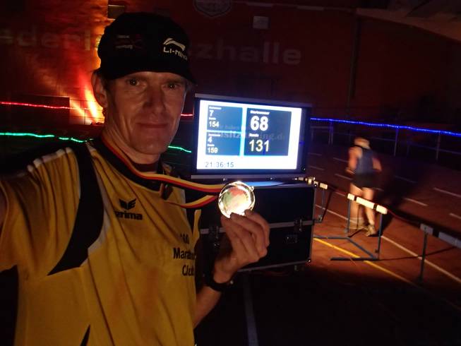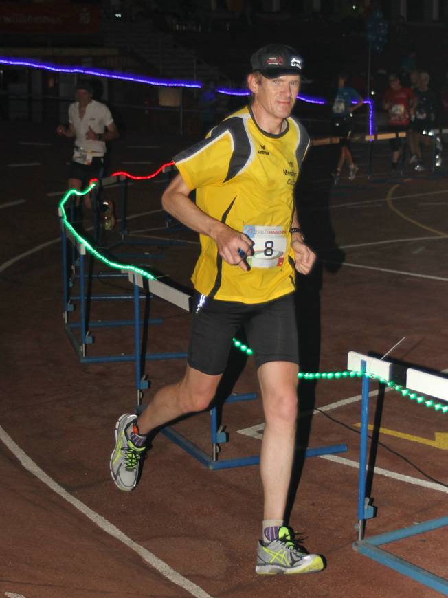 Niederlausitzhalle Senftenberg Der Marathon ging noch bis kurz nach 23.00 Uhr. Bei 5:02 Stunden kamen noch zwei Läufer ins Ziel. Der Rest mußte leider aufgeben. Für 23.00 Uhr stand schon der Halbmarathon-Start auf dem Programm. Das traf zwei Läufer. Sieben weitere waren schon zuvor ausgeschieden. |