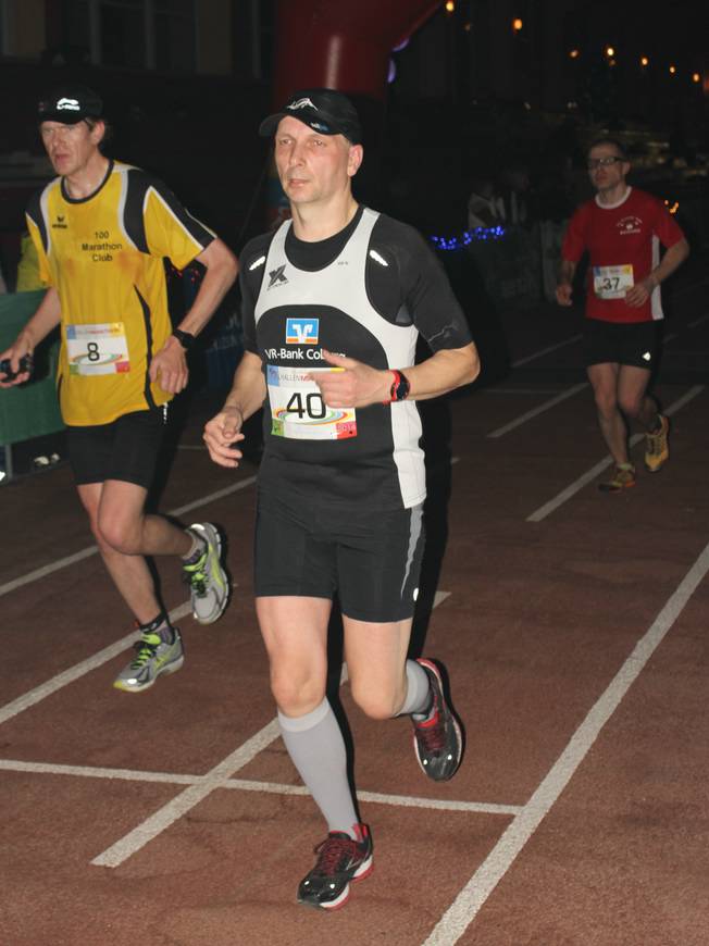 Runde 39 18.53 Uhr / Km 9,7 Ganz unten in der Kurve konnte man flach laufen. Zum Überrunden mußte man aber die Steilkurve rauf. Und das ging mächtig auf die Knochen. Zumal es ja immer einseitig war. Immerhin die klimatischen Bedingungen waren top. So 14°C, kein Wind, kein Regen, kein Schnee. Ich lief recht flott los. Aber das machten viele. Man ließ sich durch die ständigen Überrundungsvorgänge einfach mitreißen. 26:33 Minuten für die ersten und 26:47 Minuten für die zweiten fünf Km. Foto: |