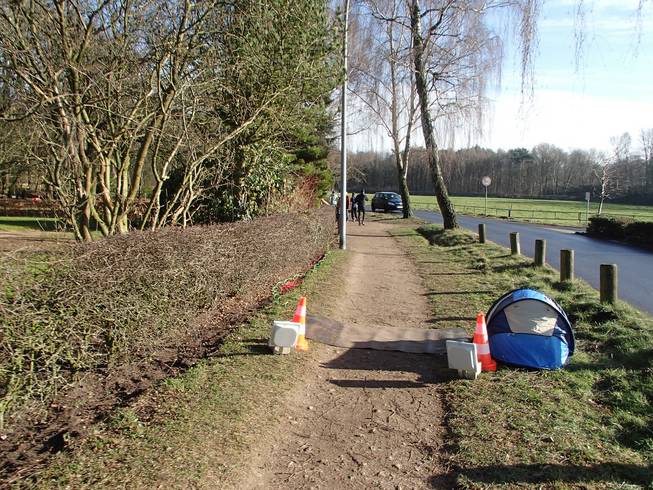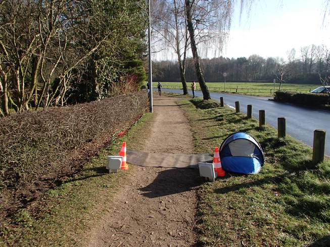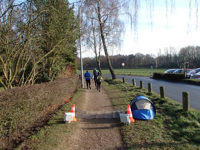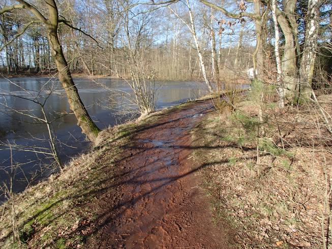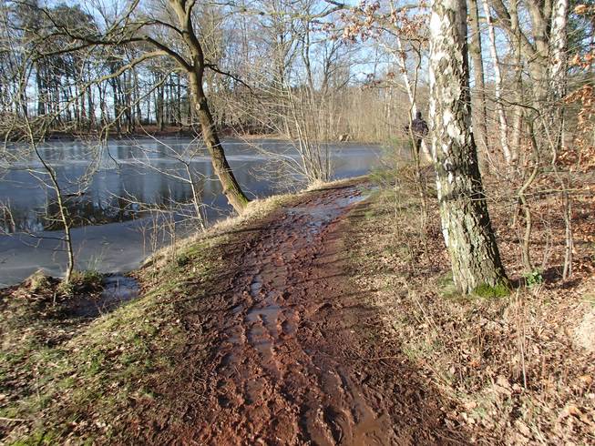 Runde 58 13.46 Uhr / Km 41,6 Da war nun wirklich keine trockne Ecke mehr zu finden. Und zu weit links konnte man nicht laufen, sonst landete man im See. Wobei... sofern man durchs Eis gekommen wäre hätte man wohl sauberes Wasser gehabt. |