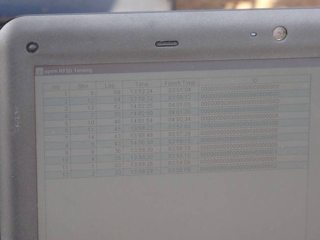 Sibirien 14.03 Uhr Das Meßsystem hatte eine Runde unterschlagen. Die 58 gezählten Runden waren daher genug. Während des Rennens war die Anzeige aber praktisch nicht lesbar. Wegen der Sonneneinstrahlung mußte man sich schon sehr genau vor den Bildschirm setzen. Das hätte sehr viel Zeit gekostet. Aber trotzdem ein tolles System. |