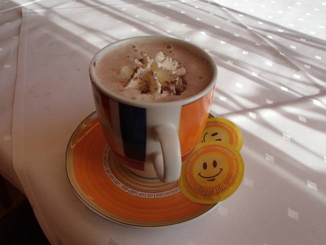 Sibirien 14.33 Uhr Laut Ausschreibung hatten wir ein Getränk (Kaffee, Kakao, Tee) und ein Stück Kuchen frei. Später hieß es dann, wir könnten soviel haben, wie wir wollten. Wohlgemerkt Gratis!! Ich nahm erst einmal zwei heiße und wahnsinnig leckere Kakao. |