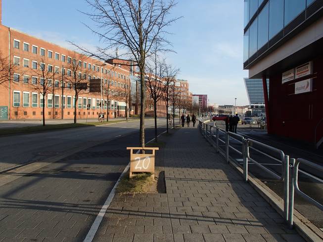 Kaistraße 9.09 Uhr Die 20 zeigte zwar den 20. Kilometer an, hätte aber auch für den 20. Marathon in Kiel stehen können. Seit 1996 wird in Kiel schon Marathon gelaufen. 1996 gleich zweimal. Darum gab es schon 2014 das Jubiläum. Für mich war es schon der sechste Marathon in Kiel. Seit 2009 lief ich jedes Jahr mit. |
