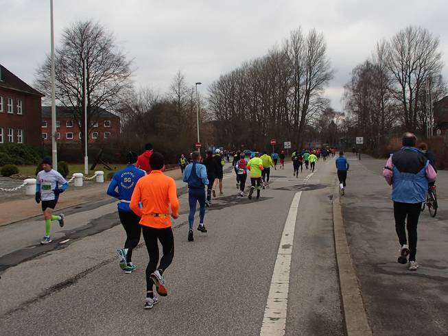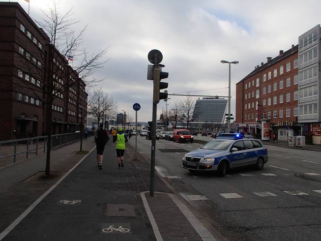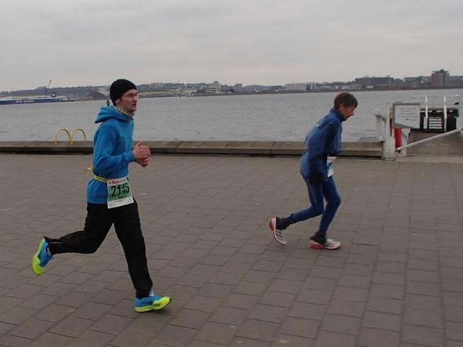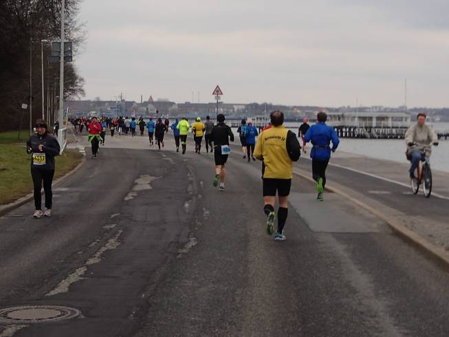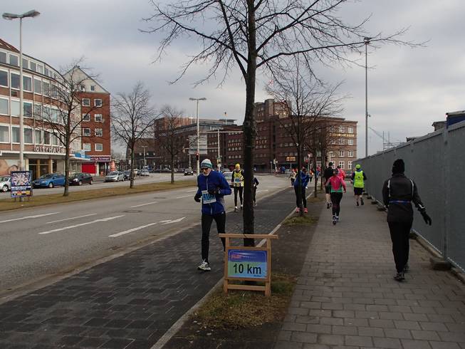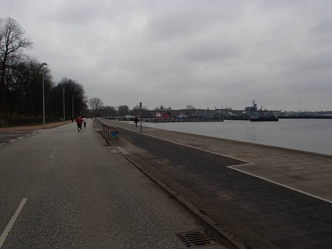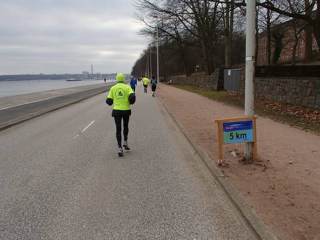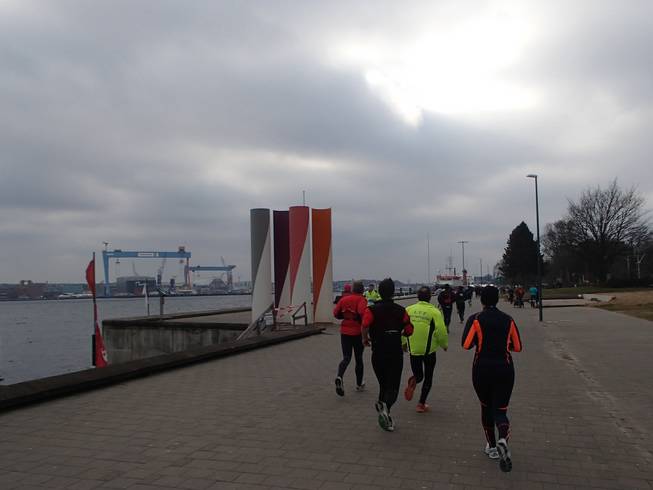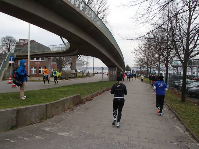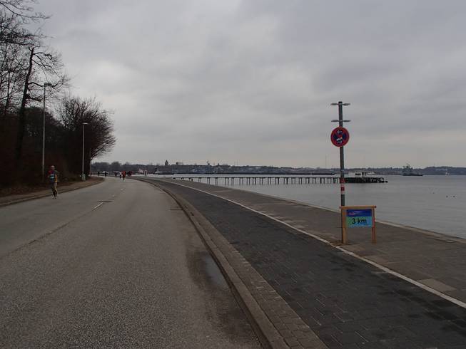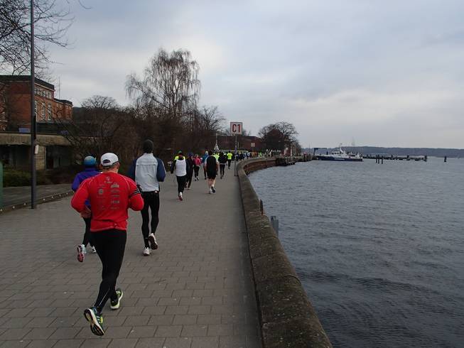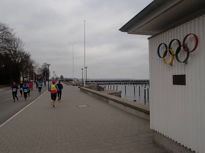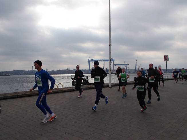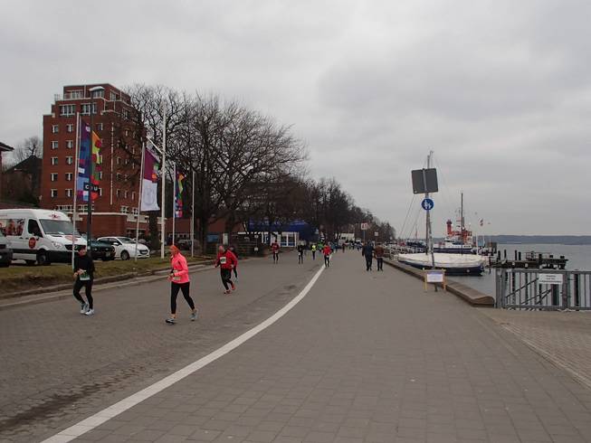 Kiellinie / Runde 1 10.29 Uhr / Km 1,6 Auf der Gegenseite kamen uns die Läufer des 10-Km-Rennens entgegen. Die waren schon um 10 Uhr gestartet. |
