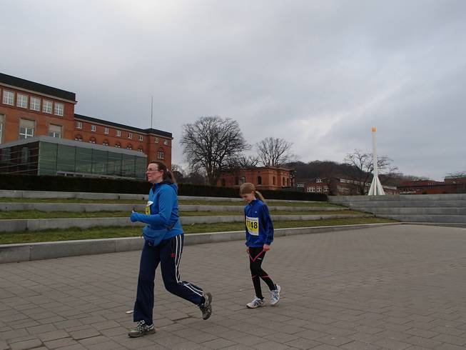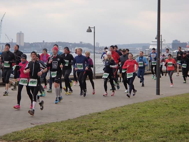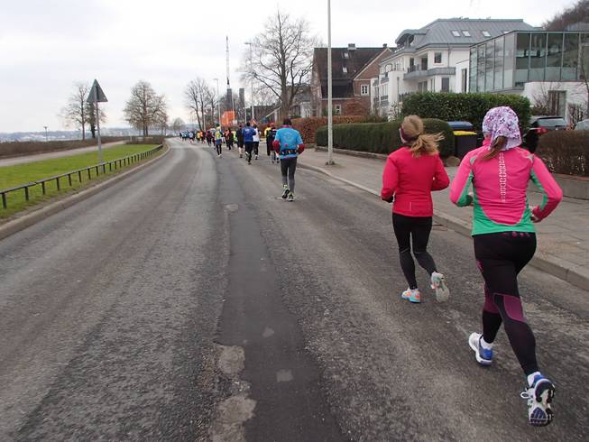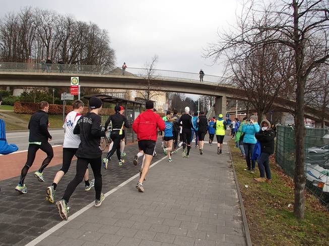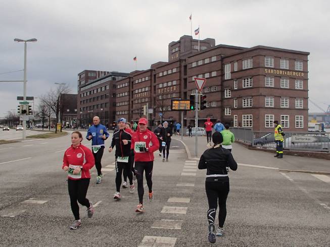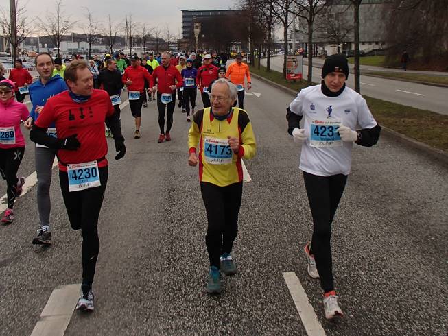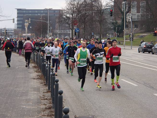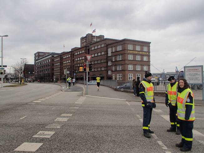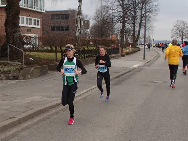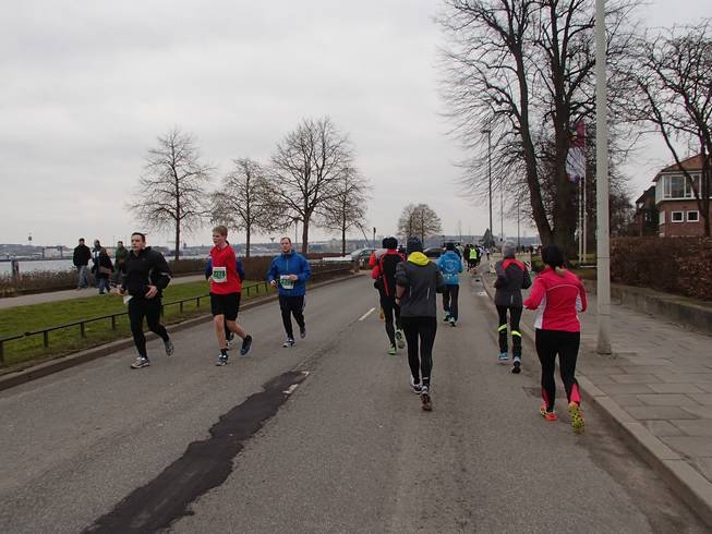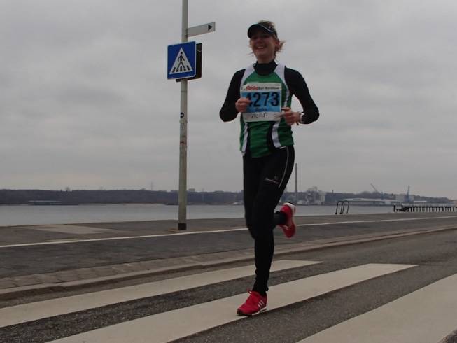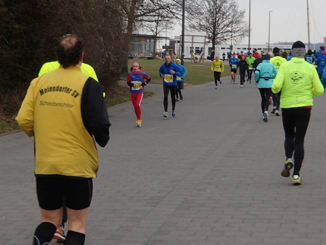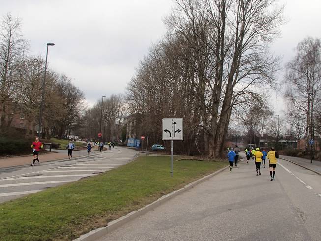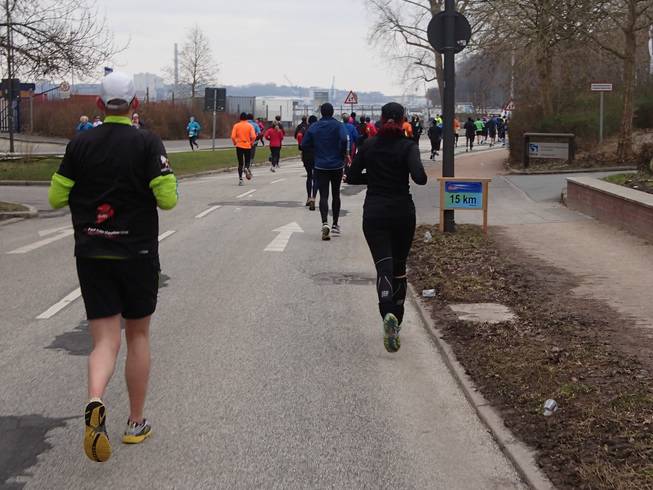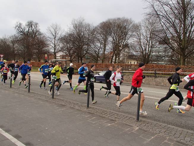 Kiellinie / Runde 1 10.29 Uhr / Km 1,6 Auf der Gegenseite kamen uns die Läufer des 10-Km-Rennens entgegen. Die waren schon um 10 Uhr gestartet. |