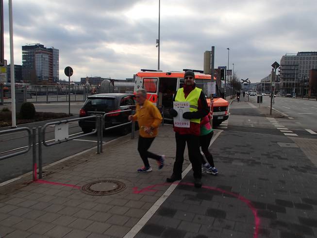 Wall / Runde 2 11.17 Uhr / Km 10,6 Ein Pulk von 602 Läufern kam, zunächst noch separat auf der Straße, von hinten auf mich zugerannt. |