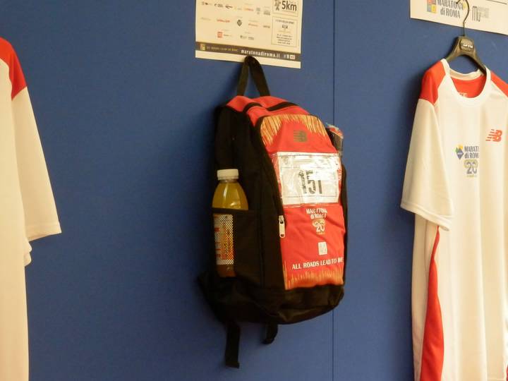 Palazzo dei Congressi Der Rucksack diente auch gleichzeitig als Beutel für die Kleiderabgabe am Tag des Marathons. Wirklich viel paßte da nicht rein, vergleichen mit den Beuteln, die zum Beispiel in Hamburg verteilt werden. Aber schicker als so ein Beutel ist ein Rucksack allemal. |