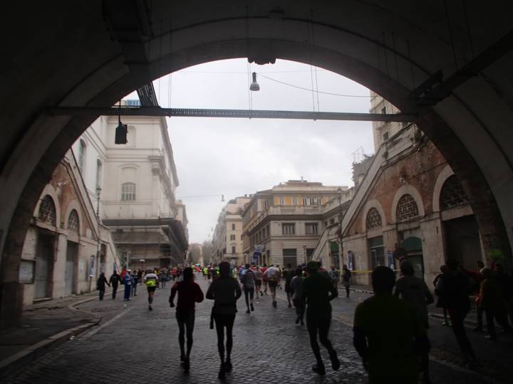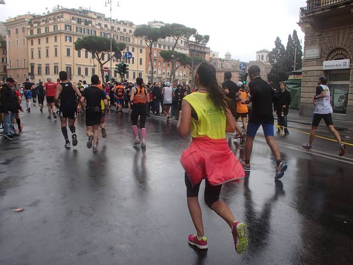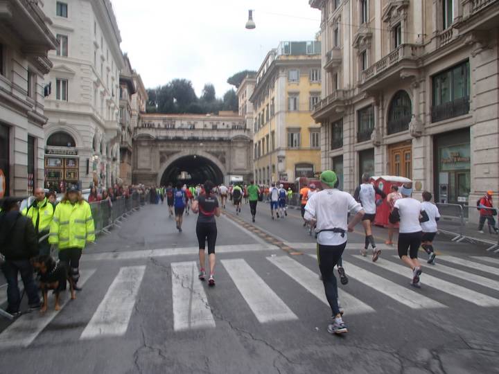Corso Vittorio Emanuele II / Largo di Torre Argentina 12.27 Uhr / Km 37,2 Wie oft hatte mich diese Dame an dem Tag eigentlich überholt? Und wie hatte sie es geschafft, daß der Knoten immer genau über der Startnummer hielt? Über was man sich so alles Gedanken macht... |