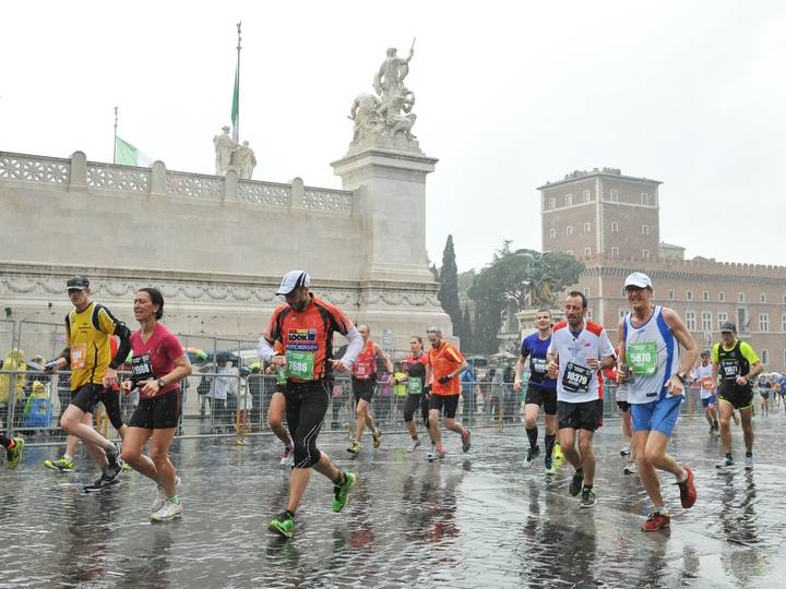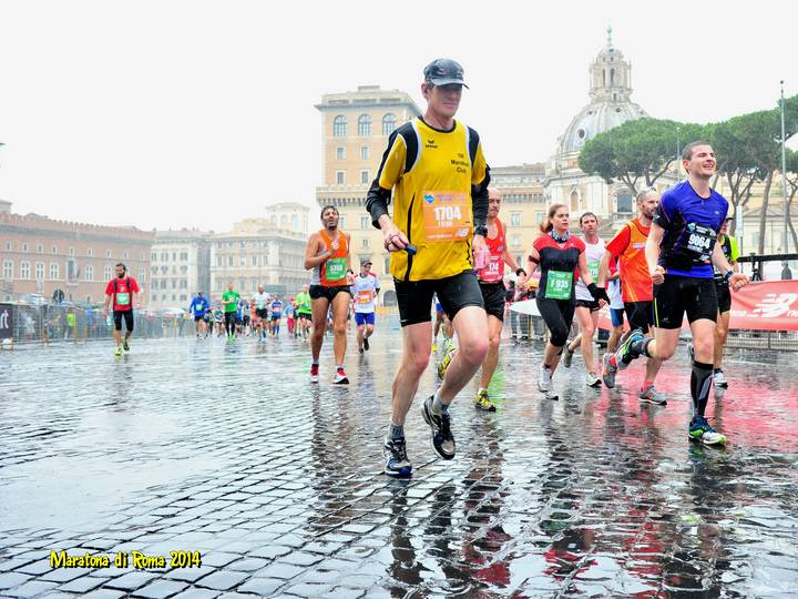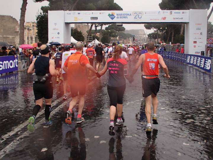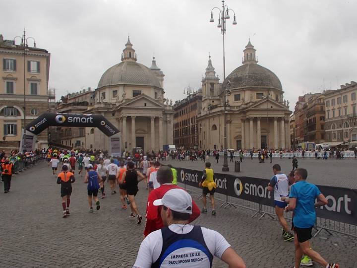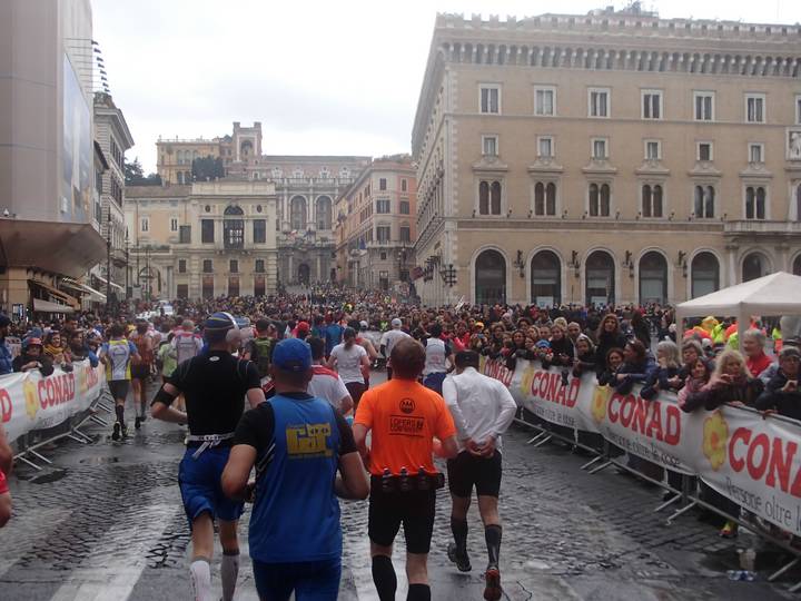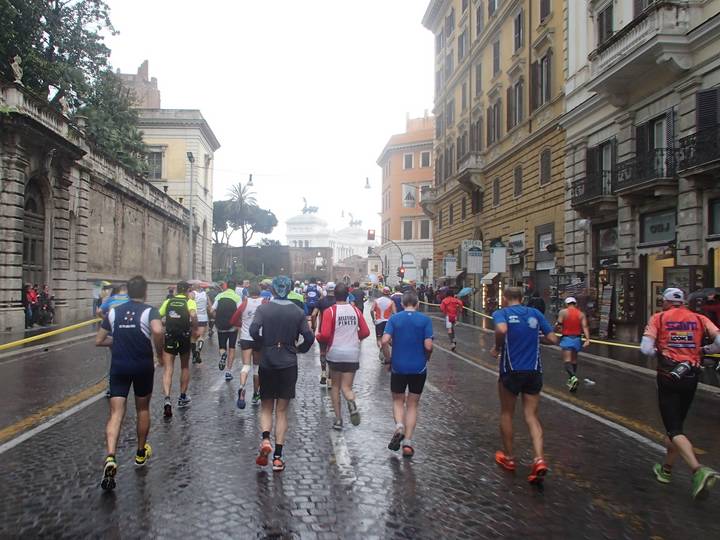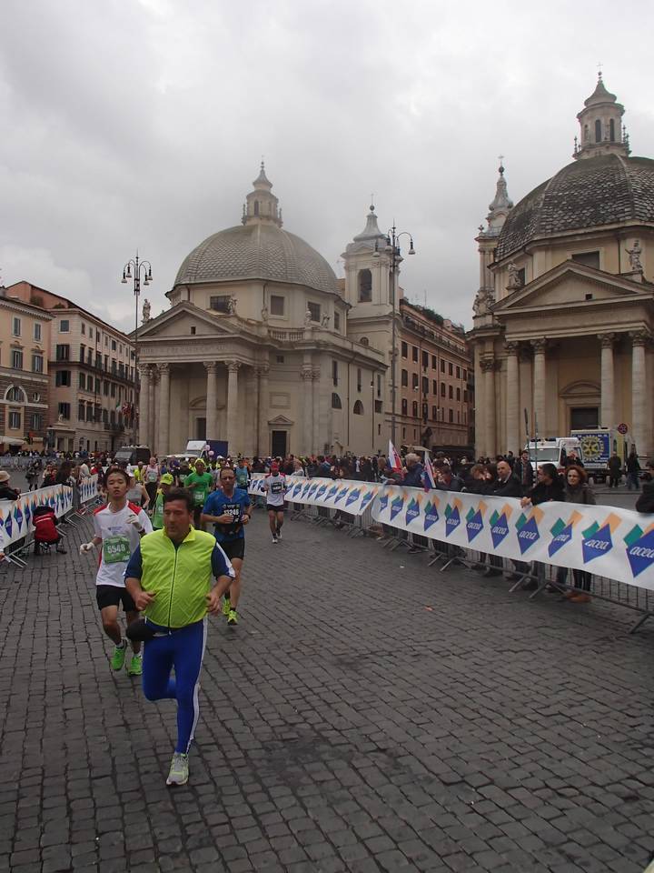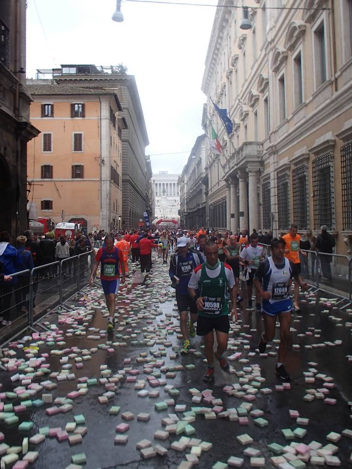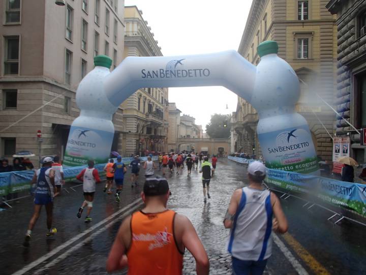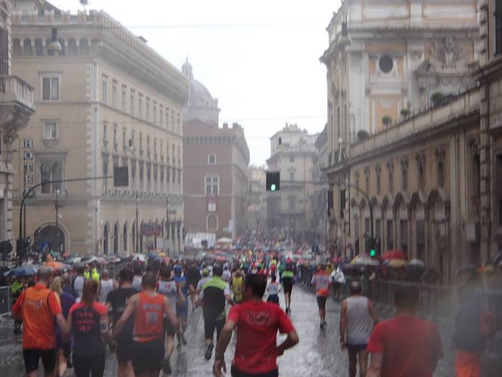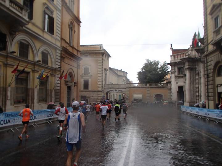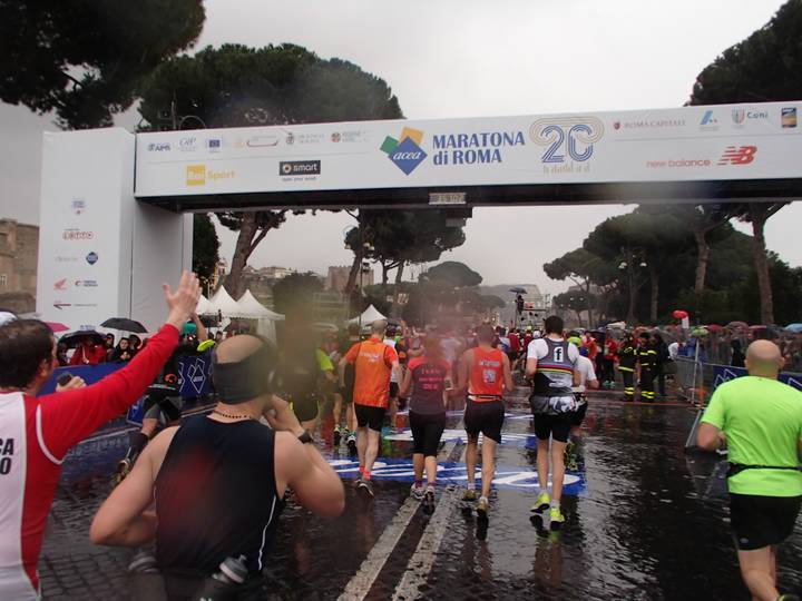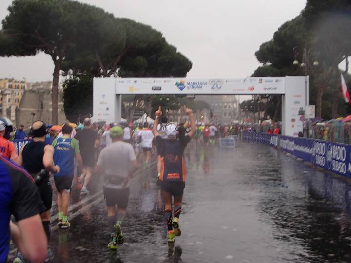 Piazza della Madonna di Loreto 12.54 Uhr / Km 42,1 So ein Finish ist natürlich Mist. Schon am Start war ich klatschnaß, weil es zuvor geregnet hatte, dann war der Lauf weitgehend trocken und nun ausgerechnet auf den letzten Metern ging wieder alles im Regen unter. |