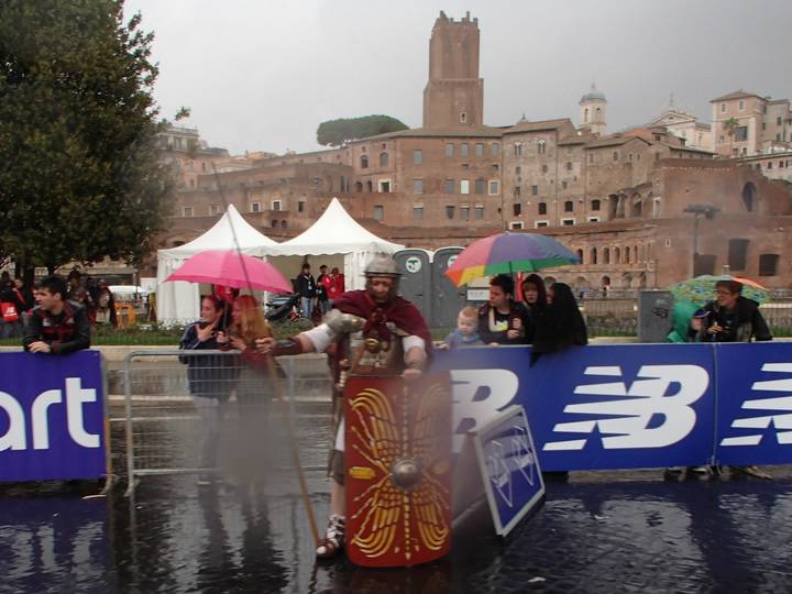 Via dei Fori Imperiali / Fori Imperiali 12.55 Uhr / Km 42,18 Ein einsamer und nasser Legionär auf den letzten Metern. Die stehen sonst oft hier Spalier. Naja... waren wohlfortgespült. |