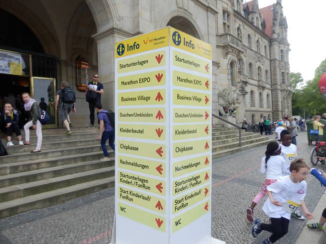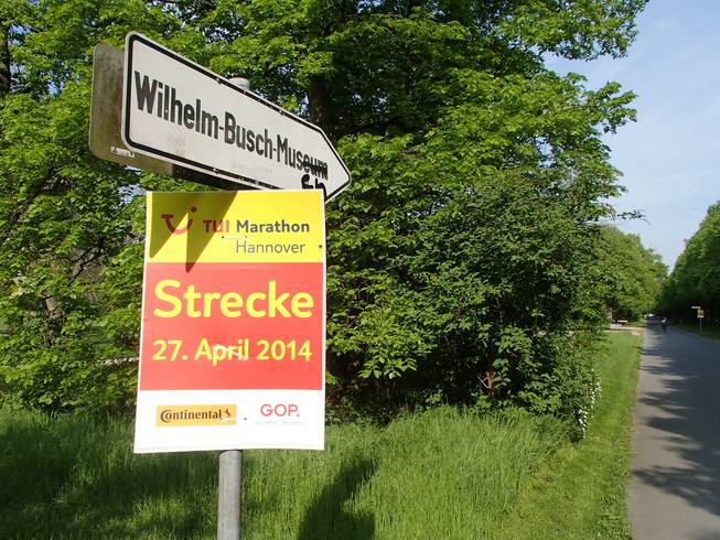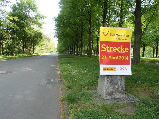 Herrenhäuser Allee 9.55 Uhr Die Strecken-Schilder fand man an jenem Samstag überall in der Stadt. Auch hier, wo am Folgetag so ungefähr Km 37 sein würde. |