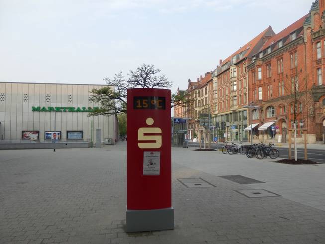 Karmarschstraße 7.55 Uhr Thermometer an der Markthalle. Schon 15°C. Das sollte sich noch auf knapp über 20°C steigern. |