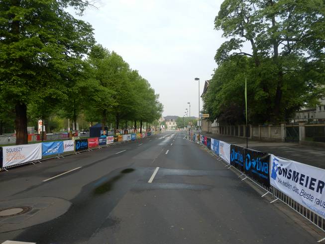 Friedrichswall 7.59 Uhr Durch diese hohle Gasse werden sie kommen. Ein Blick auf die Zielgerade. Das Ziel selbst habe ich hier im Rücken. |