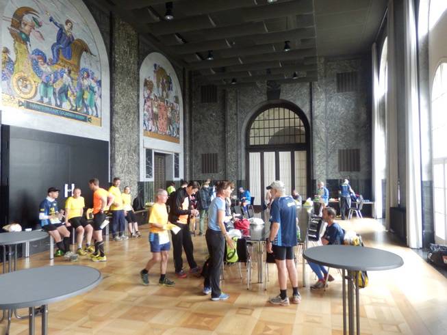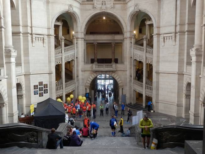 Neues Rathaus 8.15 Uhr Der Mosaiksaal war wieder für die Mitglieder der 100 Marathon Clubs reserviert und diente uns auch als Kleiderbeutelaufbewahrung. War nur halbwegs nützlich für mich. Vom Ausgang des Zielbereiches war es zum Neuen Rathaus doppelt so weit wie zu meinem Hotel, aber diesen VIP-Status mit Getränken & Co konnte ich mir doch nicht entgehen lassen. |