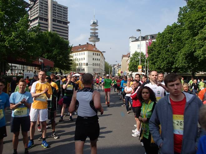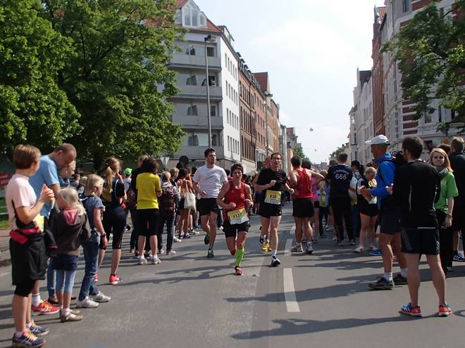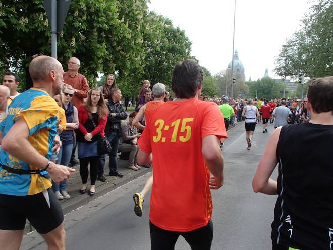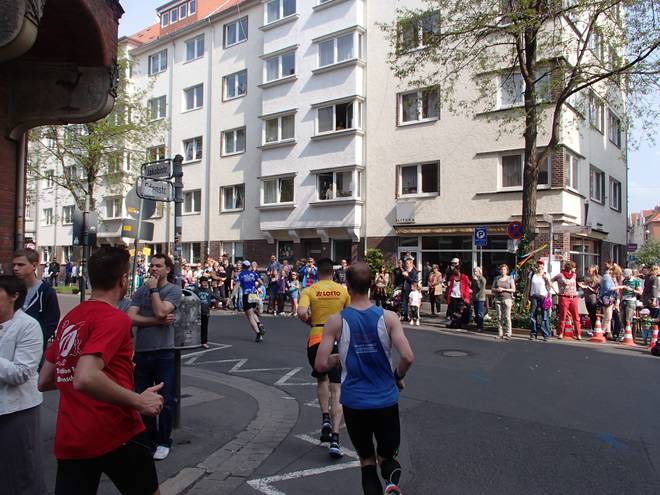 Königsworther Straße 12.15 Uhr / Km 40,4 Ich war deutlich schneller als die Masse. Die Läufer des Halbmarathons liefen auf eine Endzeit um die 1:52 Stunden zu (5:30 Min/Km), waren aber meist langsamer unterwegs. Ich lief auf 3:22 Stunden im Marathon zu (4:48 Min/Km), war aber im Schlußabschnitt schneller. |