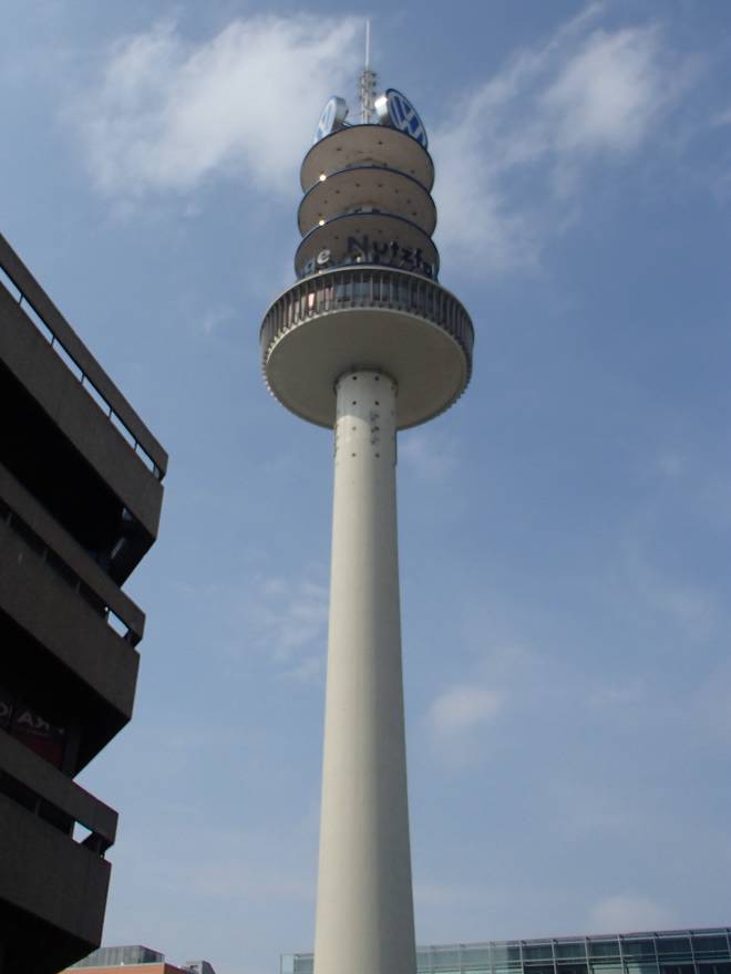 Friesenstraße 10.45 Uhr / Km 21,4 Voraus der Telemoritz oder auch VW-Tower. 1958/59 als Fernmeldeturm gebaut, 141 Meter hoch. |
