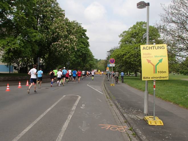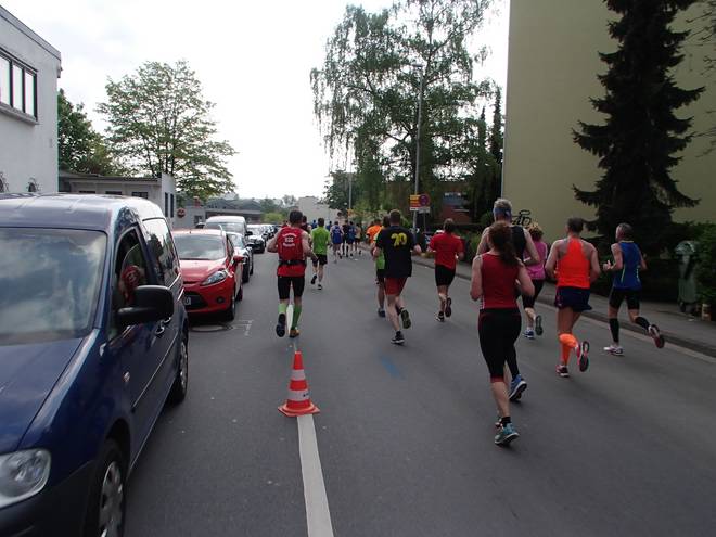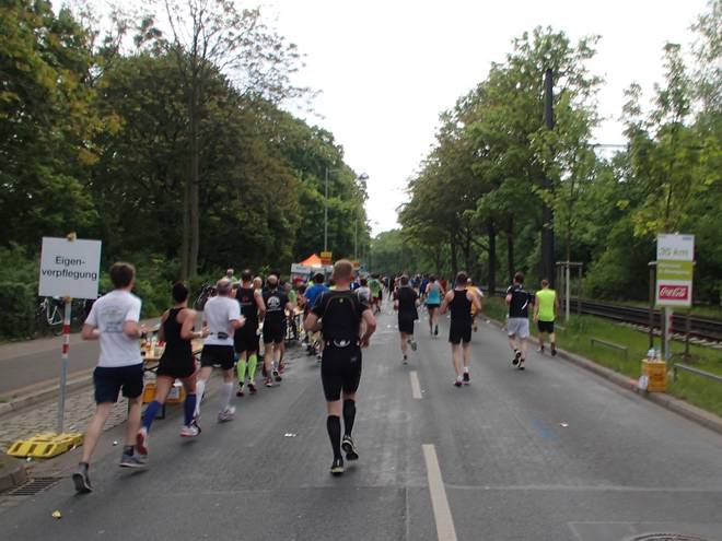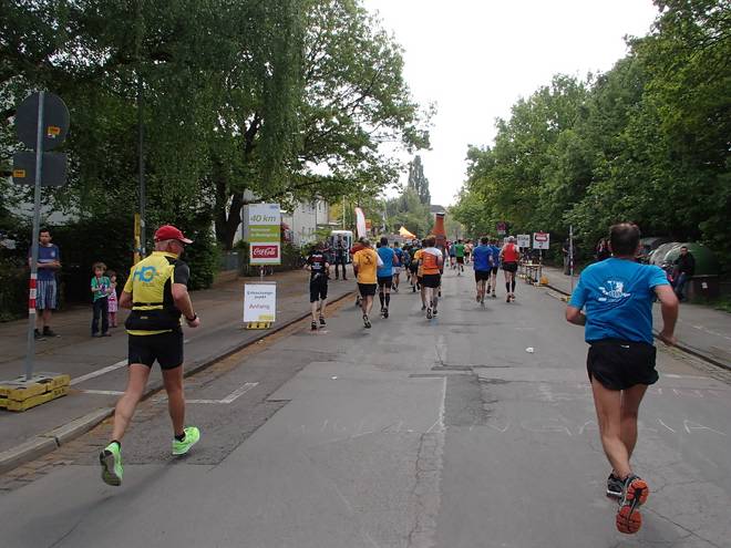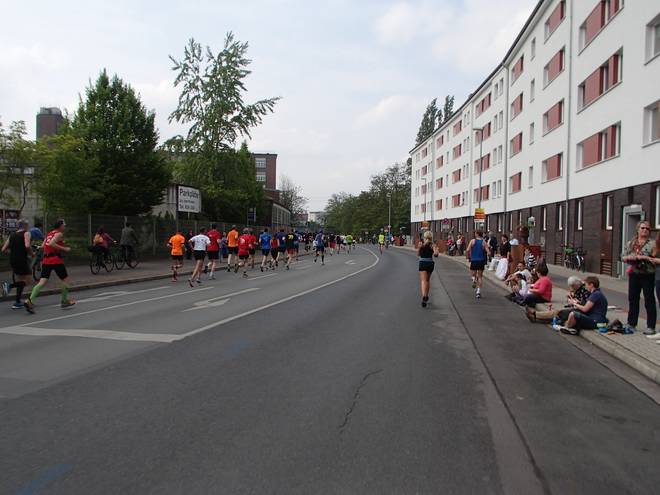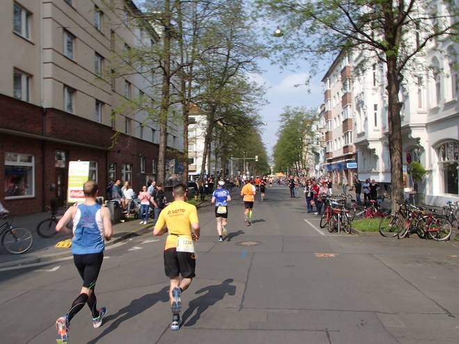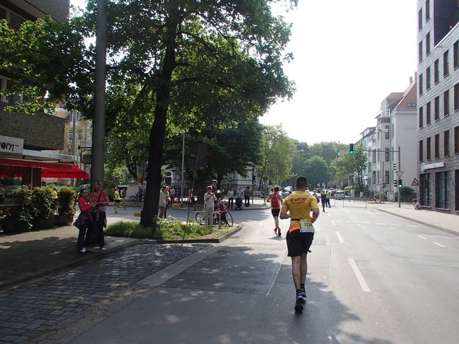 Kopernikusstraße 11.32 Uhr / Km 31,2 Es folgte das nächste Treffen mit der Strecke des Halbmarathons. Diesmal war da deutlich mehr los auf der Straße. Während wir Marathonies uns 4,2 Kilometer durch den Norden gequält hatten, waren die Halbmarathonies nach nur 500 Meter dort gewesen. |