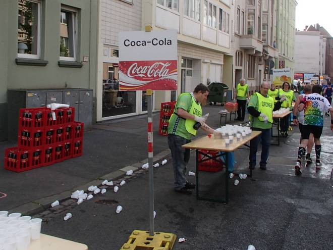 Scheffelstraße 11.38 Uhr / Km 32,5 Verpflegungspunkt Zehn. Und wieder Coca-Cola. Sehr gut. Vorab noch etwas vom Wasser und es konnte frisch weitergehen. |