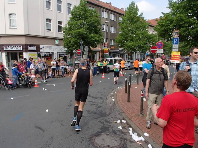 Isernhagener Straße 11.10 Uhr / Km 26,4 Verpflegungspunkt Acht. Der nächste wichtige Punkt in diesem Rennen. Zunächst fiel mein Blick hier auf das Shirt vor mir. |