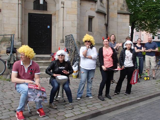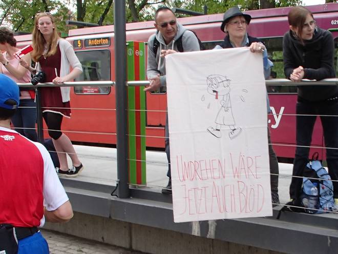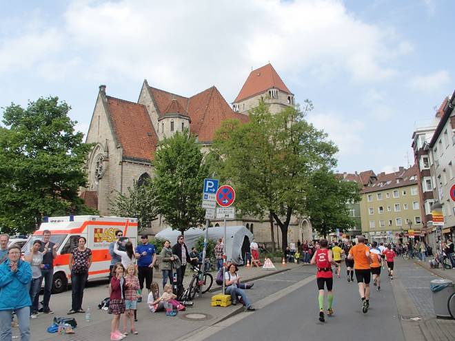 An der Lutherkirche 11.41 Uhr / Km 33,1 Prima Stimmung kann man sagen. Sieht so aus wie Karneval in Hannover |
