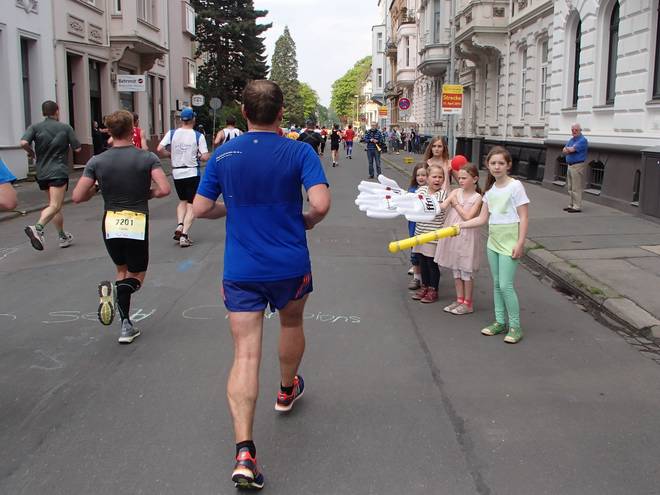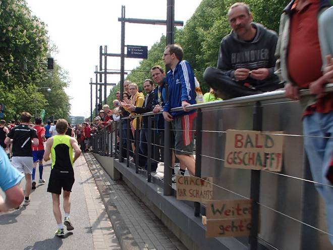 Edenstraße 10.51 Uhr / Km 22,5 Da an der Ecke stand ein kleines Mädchen mit einem Schild. Darauf ein Herz und der Spruch "Drück hier für neue Kraft" (oder ähnlich, das Foto ist nix geworden). |