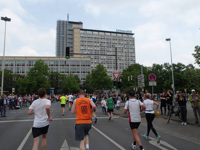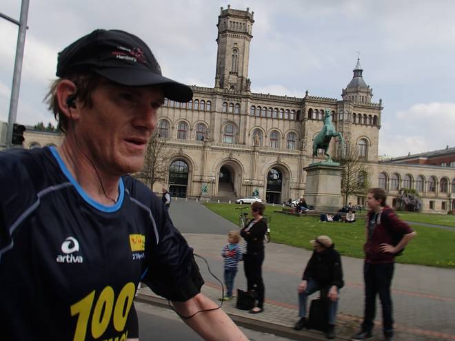 Nienburger Straße 11.51 Uhr / Km 35,2 Vor der Universität das Niedersachsenpferd und ganz vorne laufe ich. |