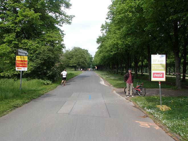 Herrenhäuser Allee / An der Graft 12.03 Uhr / Km 37,8 Der nördlichste Punkt in den Herrenhäuser Gärten war erreicht. Von nun an ging es Richtung Ziel. Noch 4,4 Kilometer. |
