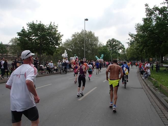 Friesenstraße 10.46 Uhr / Km 21,5 Aber von überholenden Läufern ließ ich mich nicht nervös machen. Inzwischen gibt es zu viele Marathons mit Staffeln dabei. Oder Marathons mit vielen Runden. |