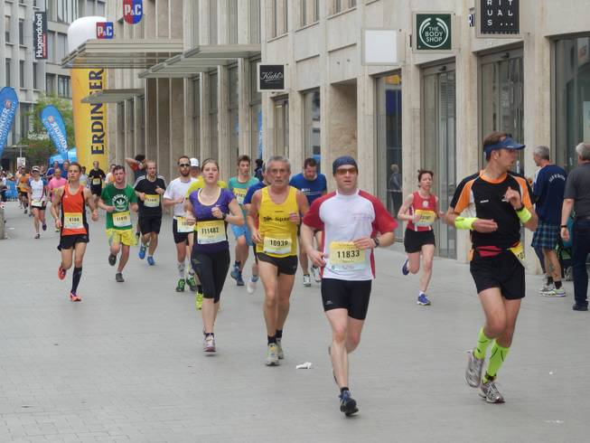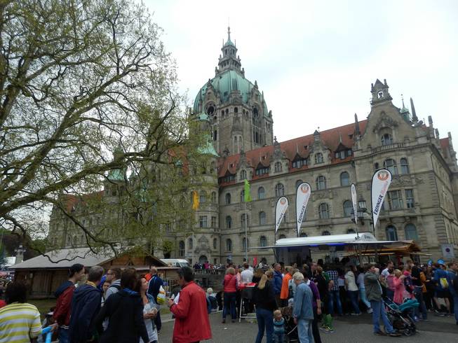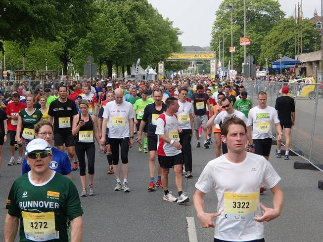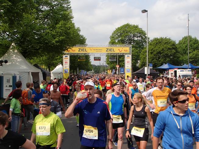 Friedrichswall / Tramplatz 12.39 Uhr Es dauerte eine Weile, sich durch die Massen zu kämpfen. Marathonläufer waren es nur wenige. Dafür Halbmarathonläufer, die knapp unter zwei Stunden geblieben waren. Und das Feld hatte 6036 Starter. |
