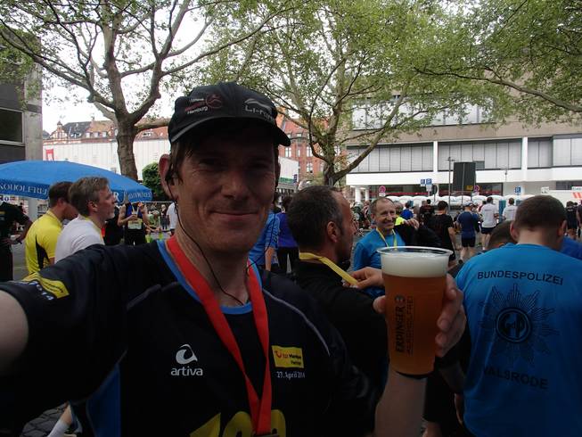 Marktstraße 12.30 Uhr Die Zielverpflegung war recht zweiseitig. Kurz hinter dem Ziel kam zunächst ein Stand mit Wasser und hier gab es nun Bier. Dafür hätte man allerdings den Gutschein mit zum Lauf nehmen müssen, um ihn dann hier gegen Bier eintauschen zu können. |